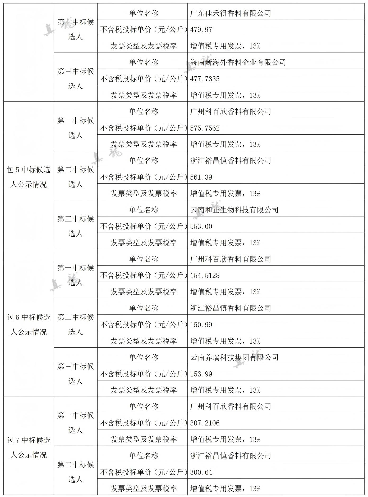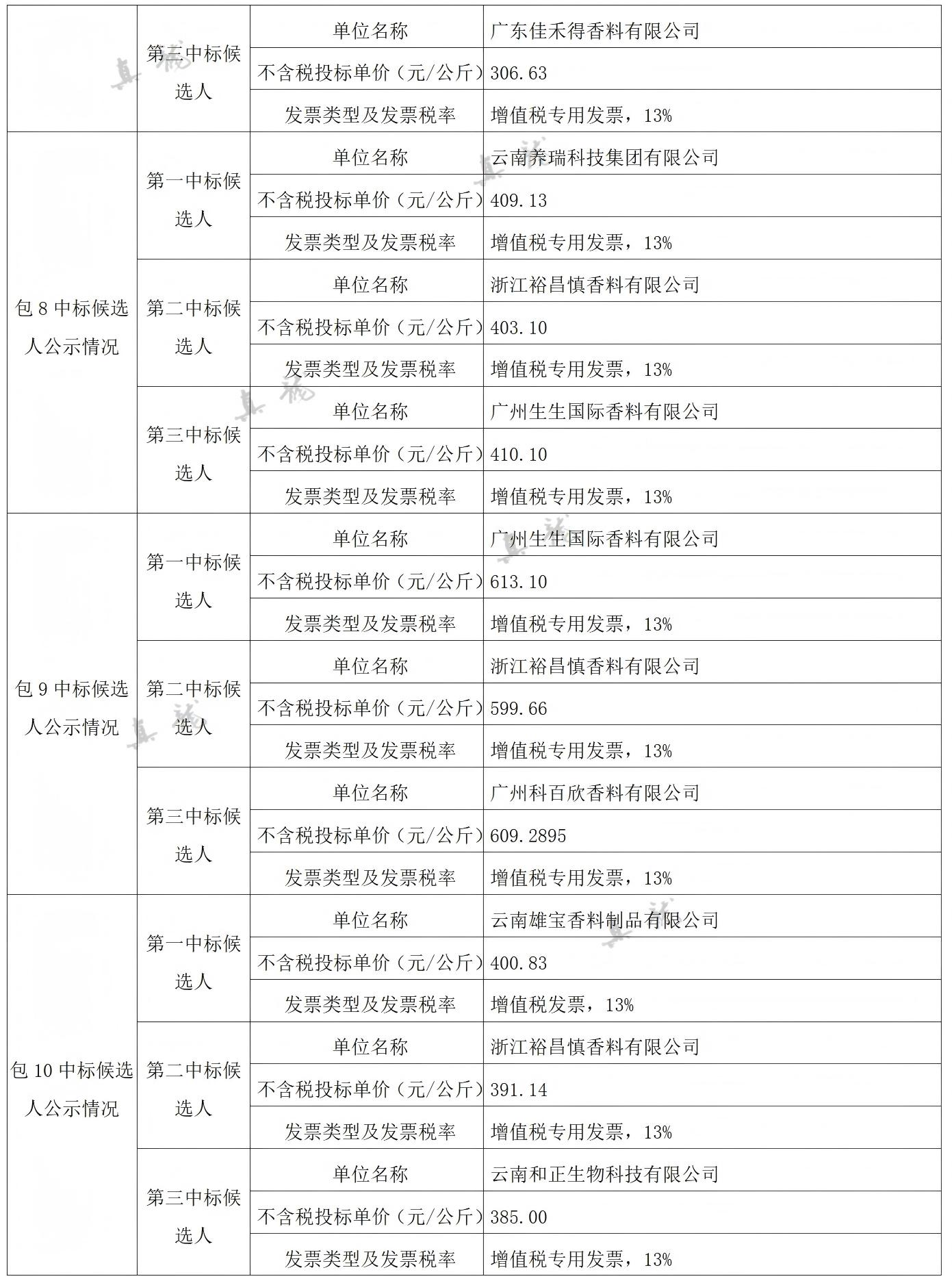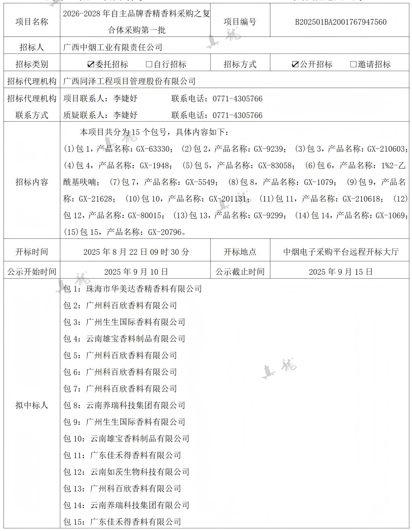 廣西中煙工業(yè)有限責任公司2026-2028年自主品牌香精香料采購之復合體采購第一批(項目編號:B202501BA2001767947560)中標候選人公示