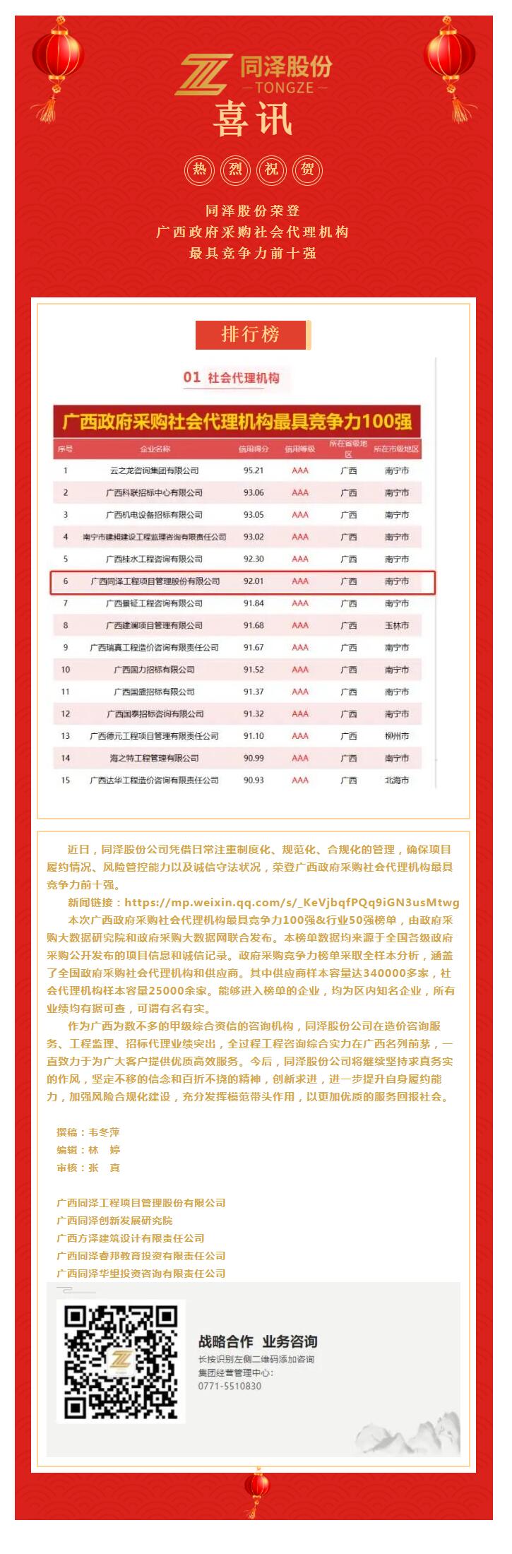 喜訊|同澤股份榮登廣西政府采購社會(huì )代理機構最具競爭力前十強